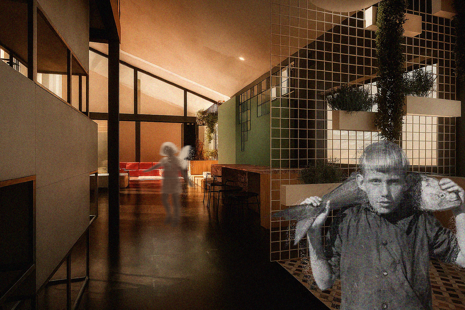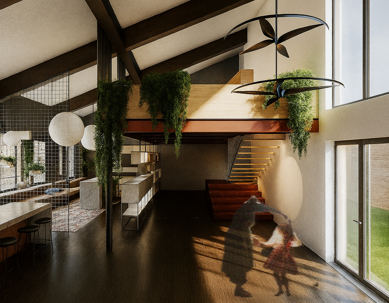 House M transforms an industrial shell into a layered domestic landscape. A tall roof, a light metal grid, and suspended greenery organise day-to-day life while leaving room for imagination. Archival figures and “ghosted” silhouettes appear in the visualisations as markers of memory, play and ritual—reminding us that a home is built as much from stories as from materials.
