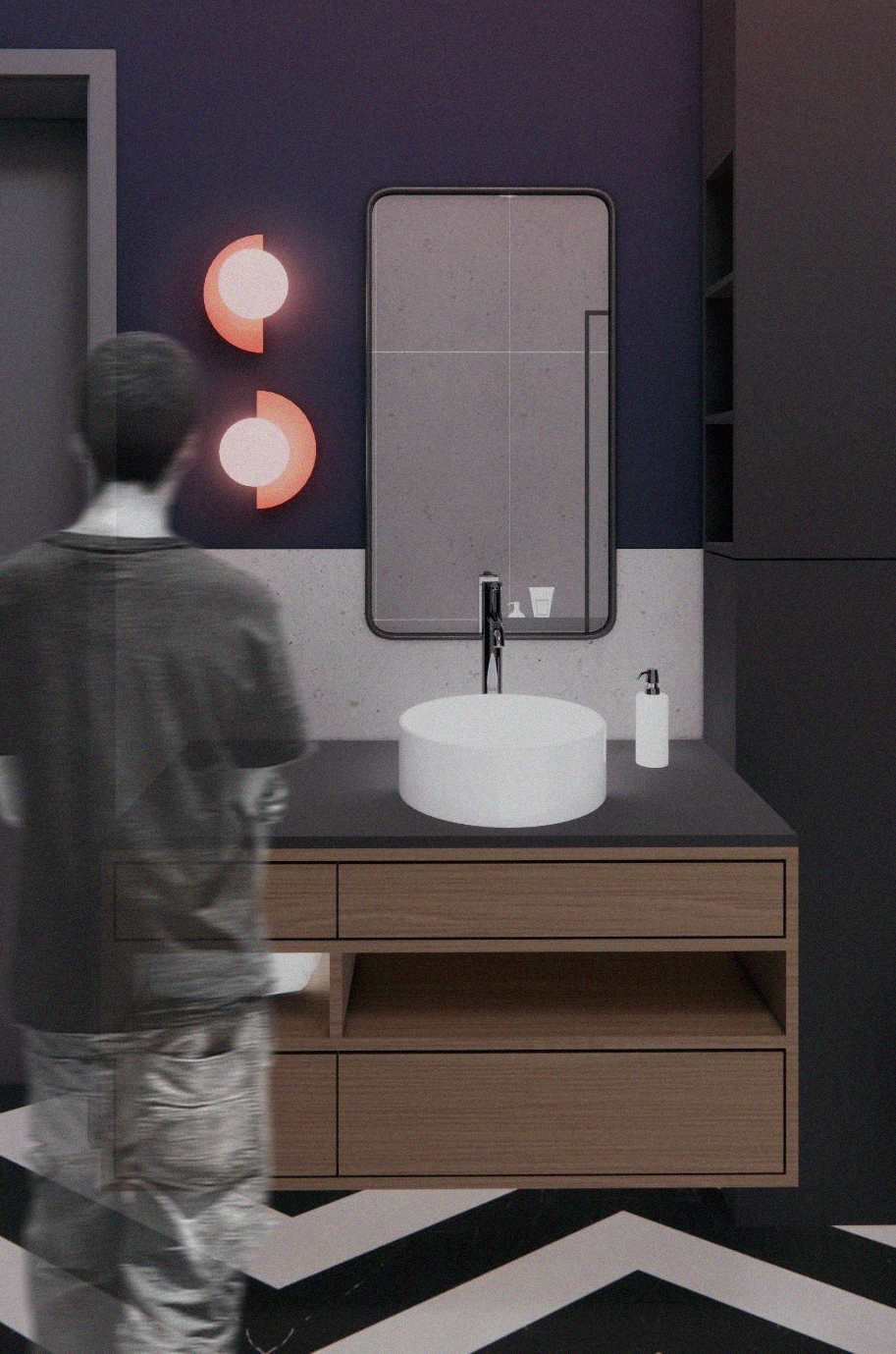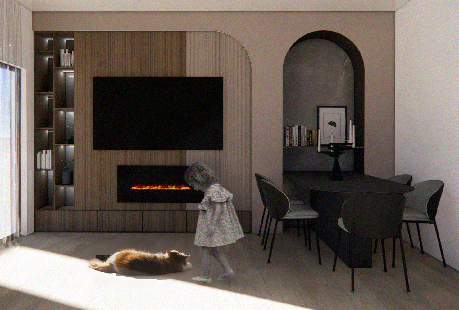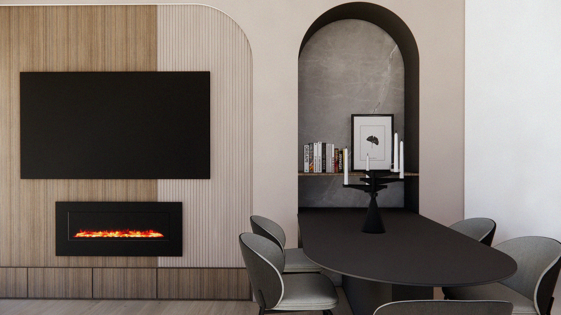 Apartment G balances soft curves and crisp lines. A tailored wall with an electric fireplace and arched niche anchors the living–dining space, while a dark–light palette, ribbed fronts and stone surfaces tie the home together. The bathroom brings bold geometry and calm lighting to a compact footprint