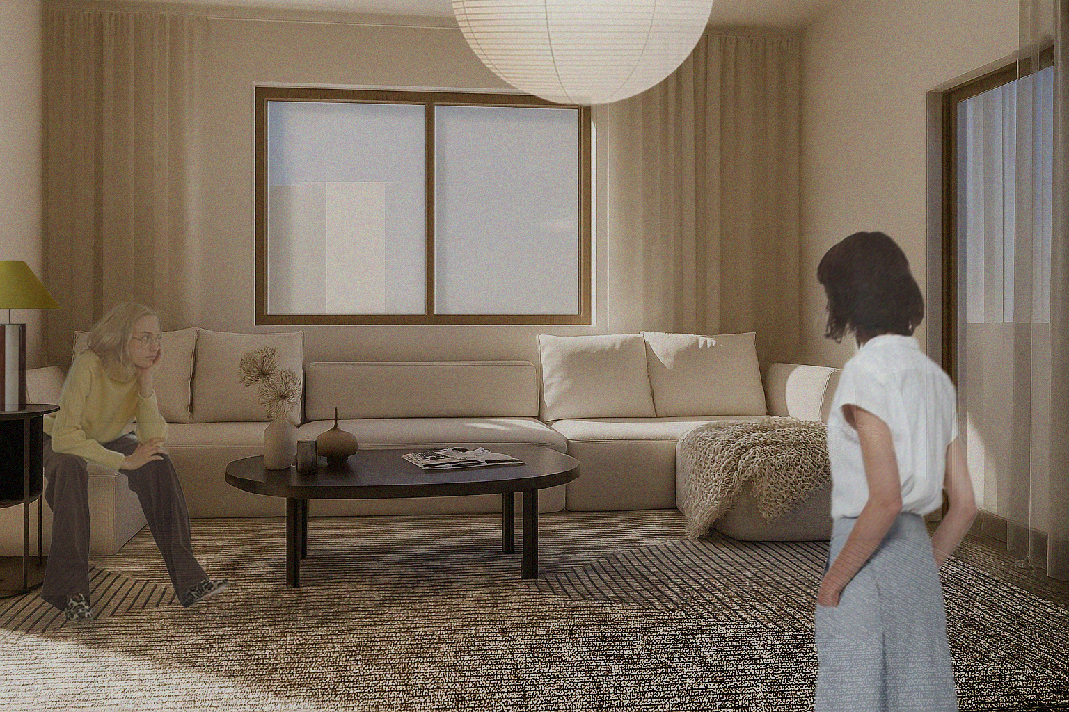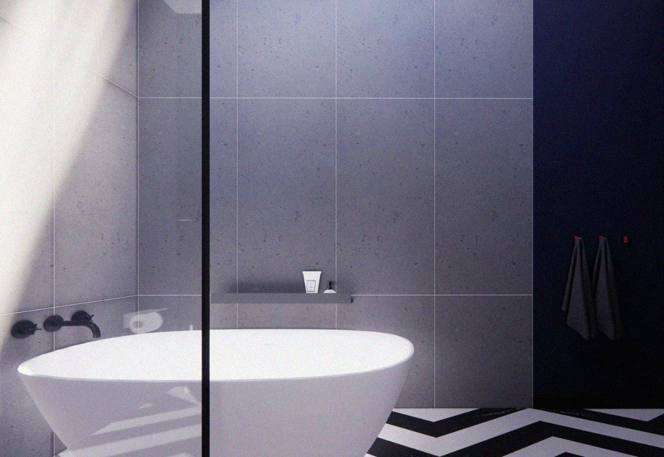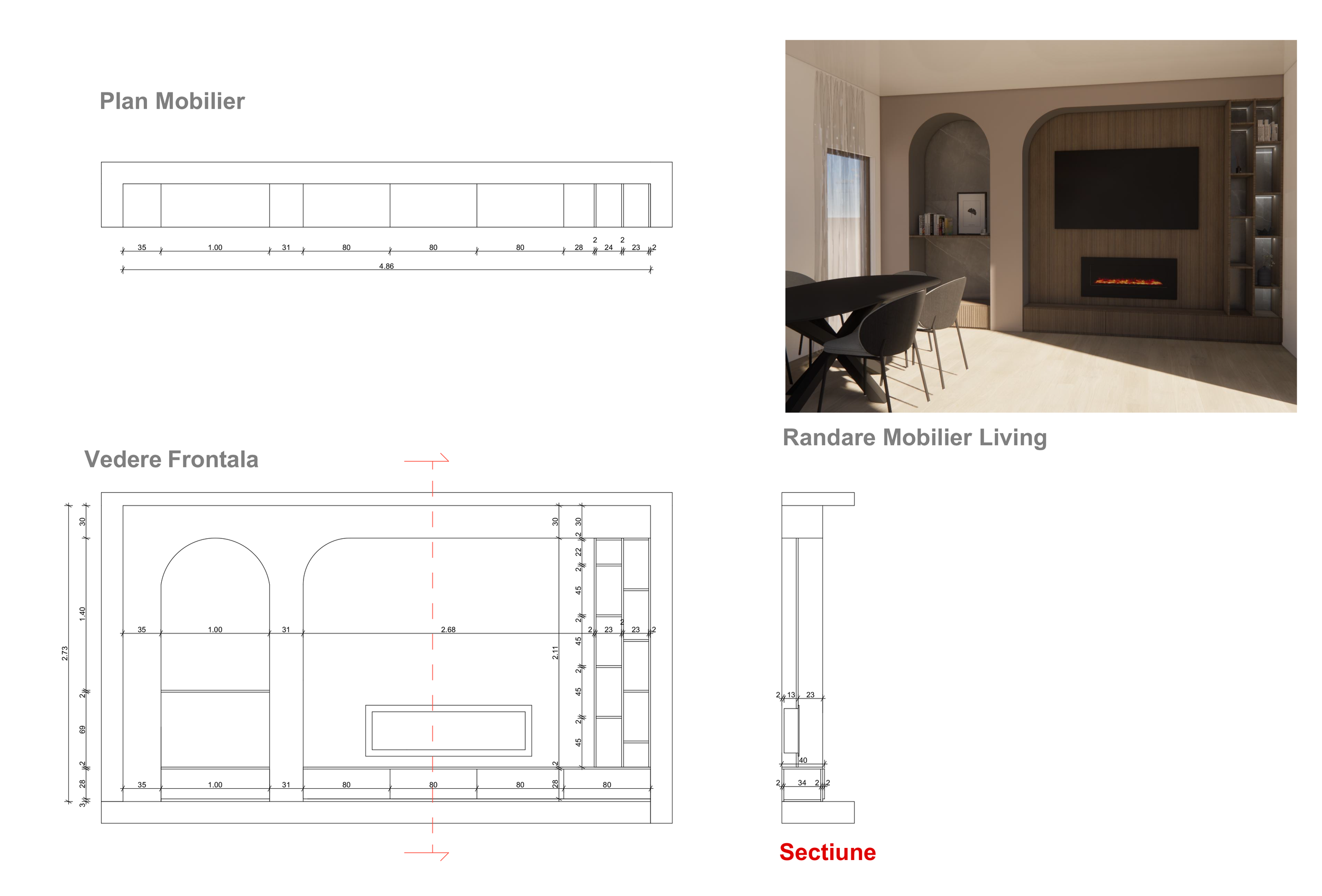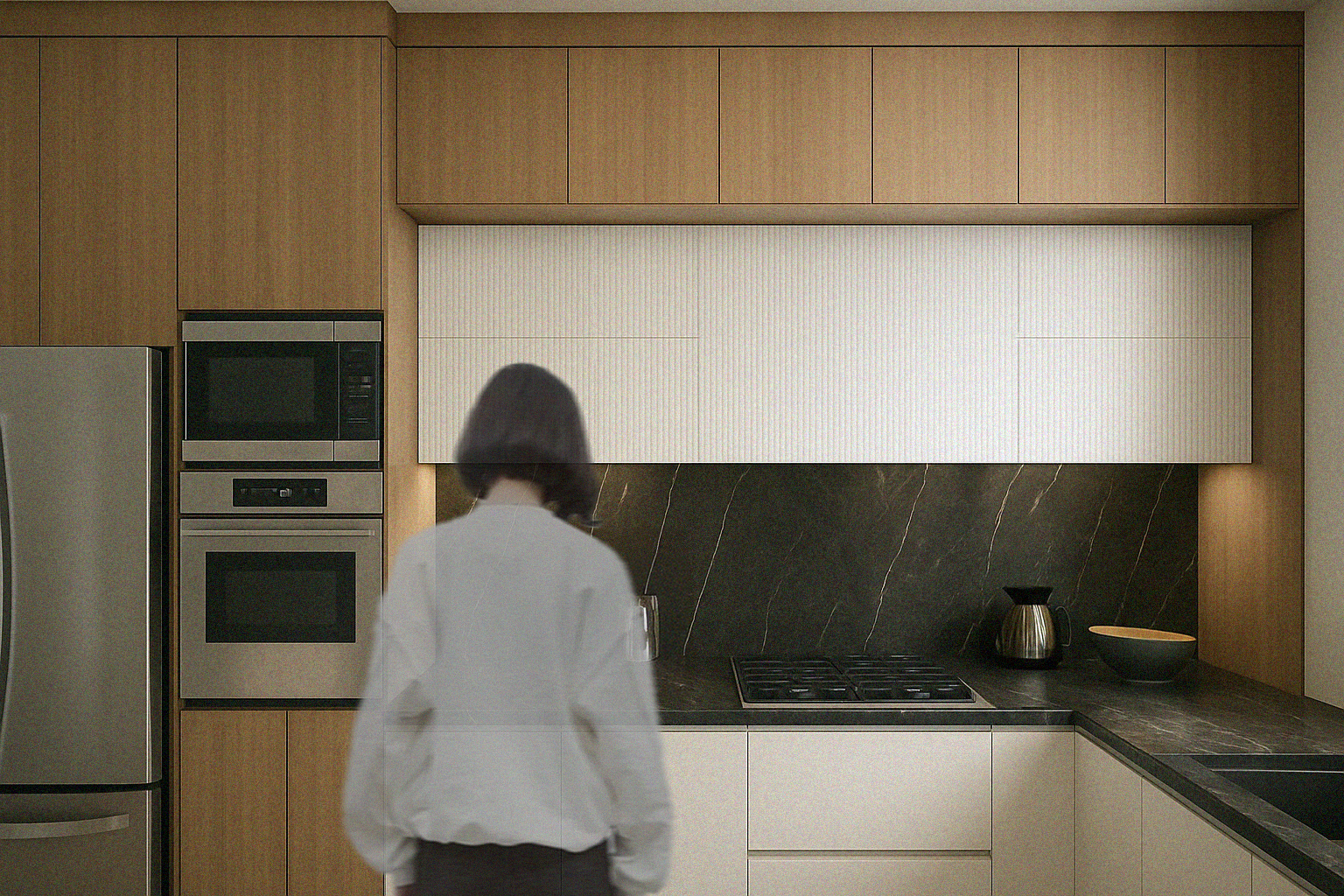 Apartment G balances soft curves and crisp lines. A tailored wall with an electric fireplace and arched niche anchors the living–dining space, while a dark–light palette, ribbed fronts and stone surfaces tie the home together. The bathroom brings bold geometry and calm lighting to a compact footprint