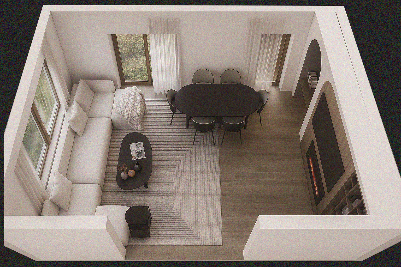 Living + dining: The fireplace anchors the room; the arched alcove wraps the table for a cozy corner.
