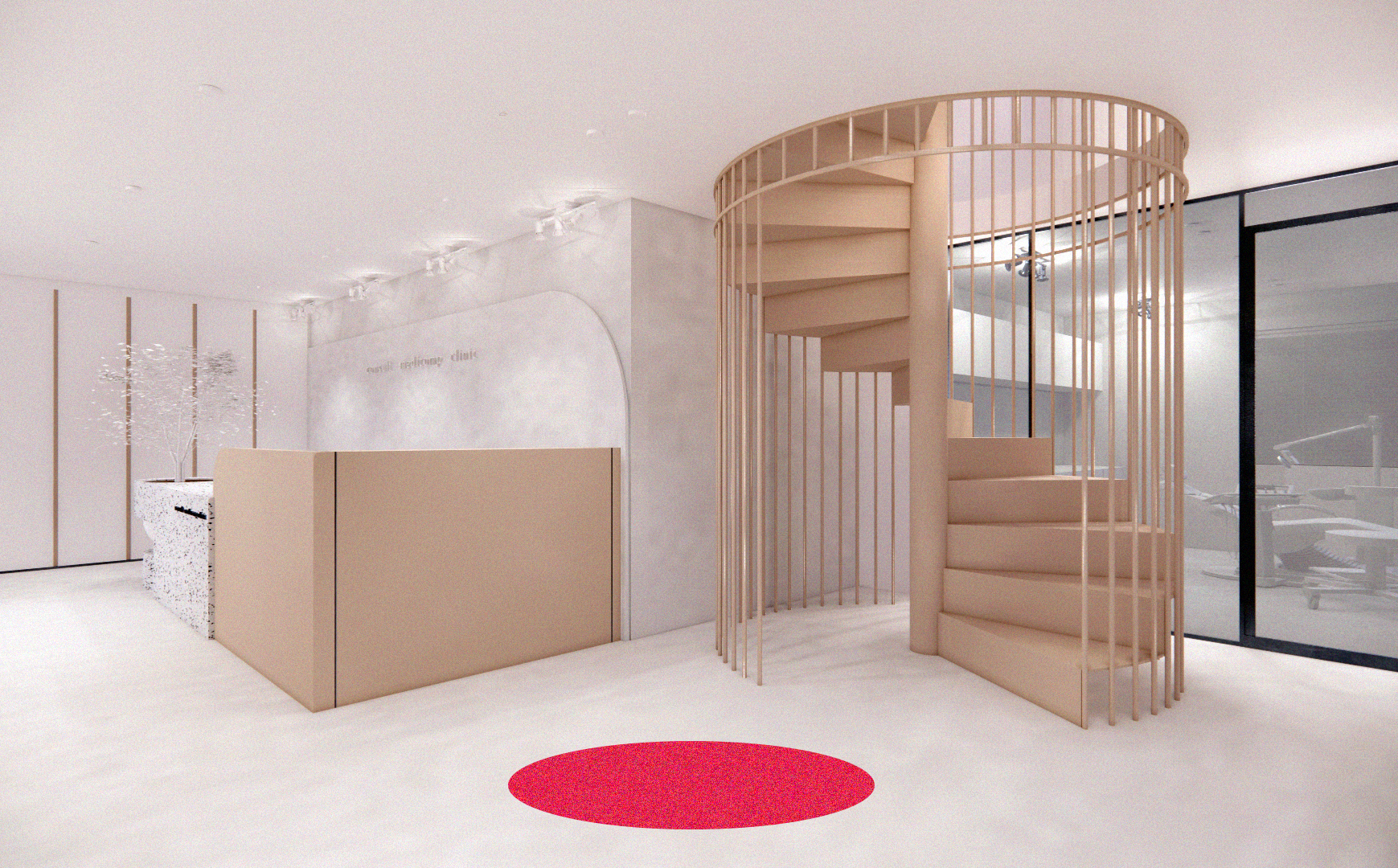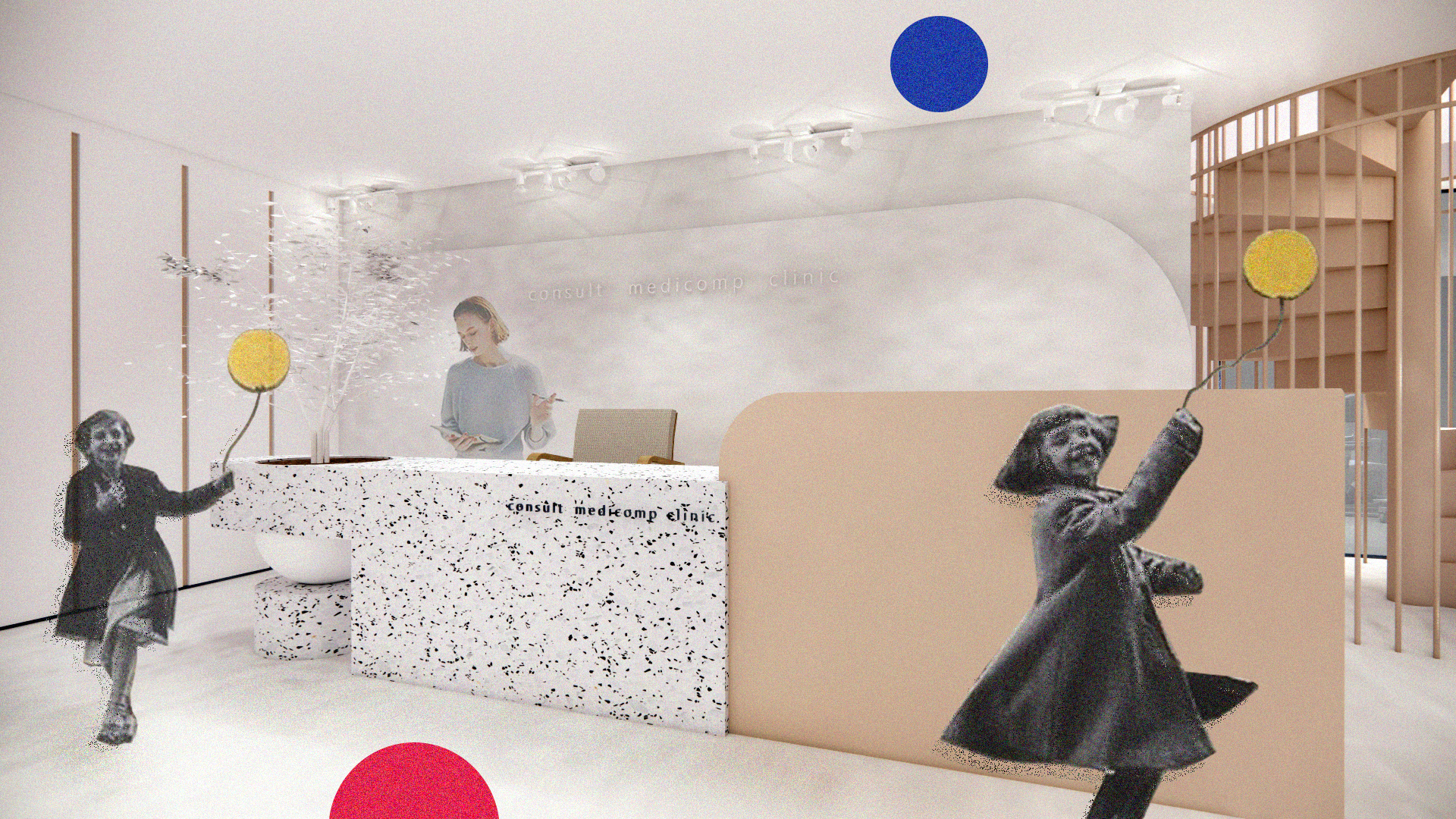 The design uses soft geometry—arches, a circular stair and rounded counters—to reduce clinical harshness. Neutral surfaces (mineral plaster, terrazzo, lacquered cabinetry) create a calm base; colour dots act as wayfinding and a playful cue. Workflows are arranged around a compact sterilisation core and clear patient/staff paths.