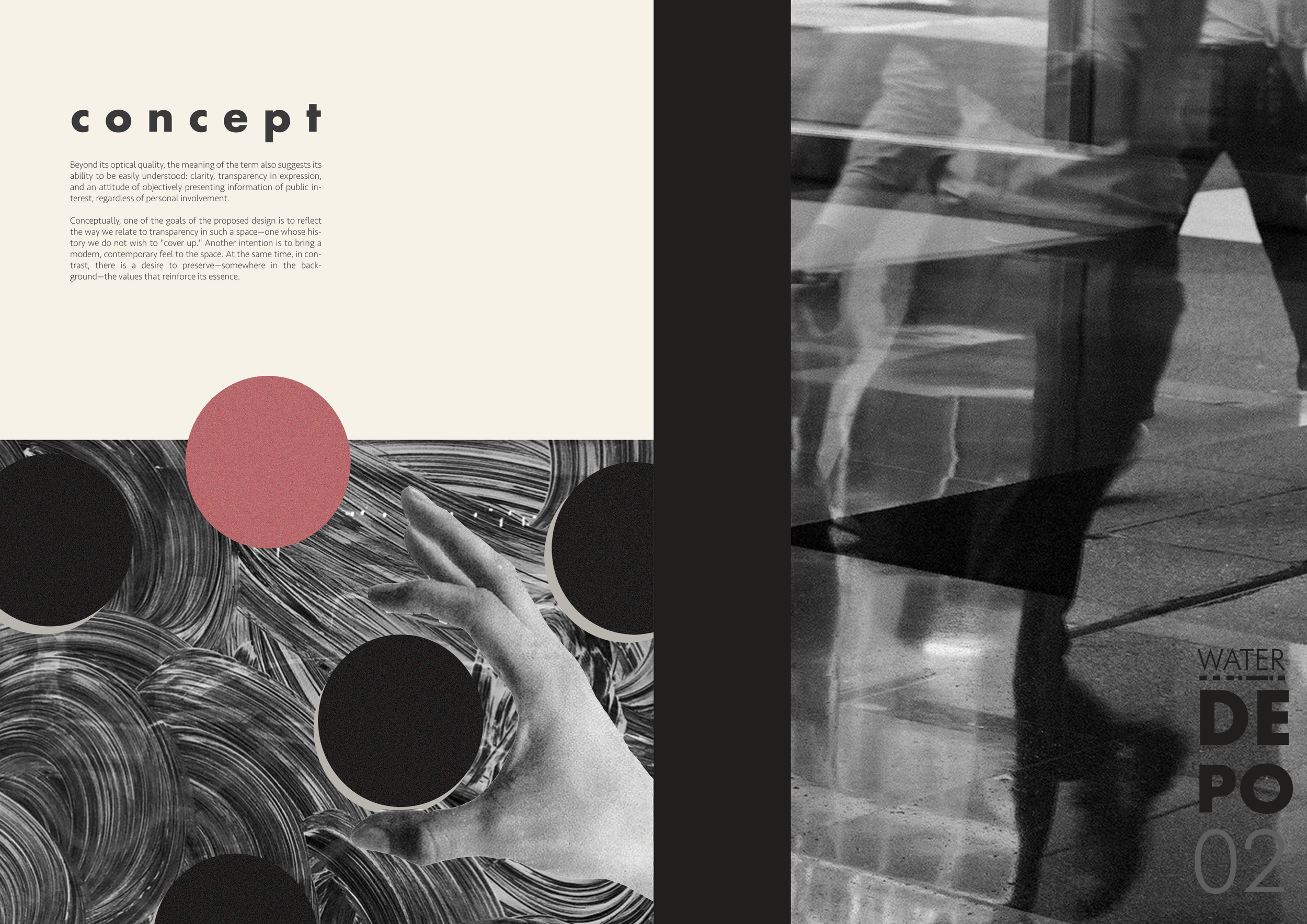 This section presents the broader visual concept behind the Industrial Water Museum. Through spatial references, symbolic elements, and branded mockups, the identity explores themes of transparency, memory, and public access โ aiming to reframe industrial space as a place for reflection, community, and contemporary culture.